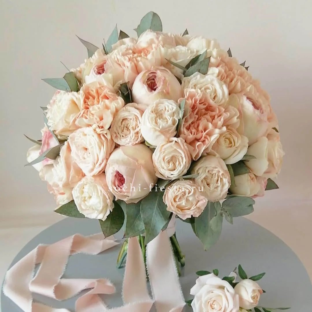 Свадебная композиция из роз эустомы и сезонных акцентов держит форму и остается свежей долгое время. Эвкалипт завершает структуру букета добавляя практичности торжественному образу.