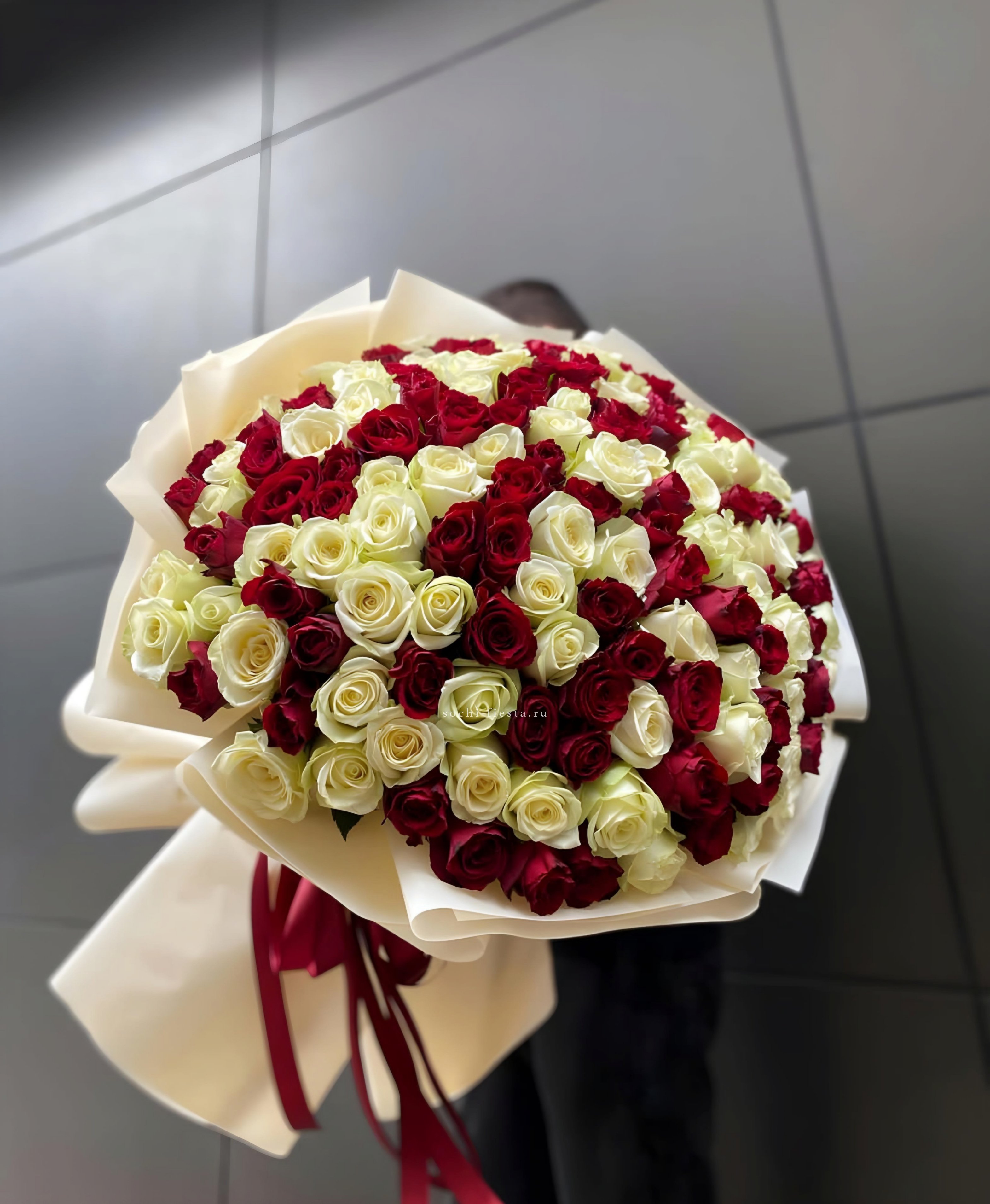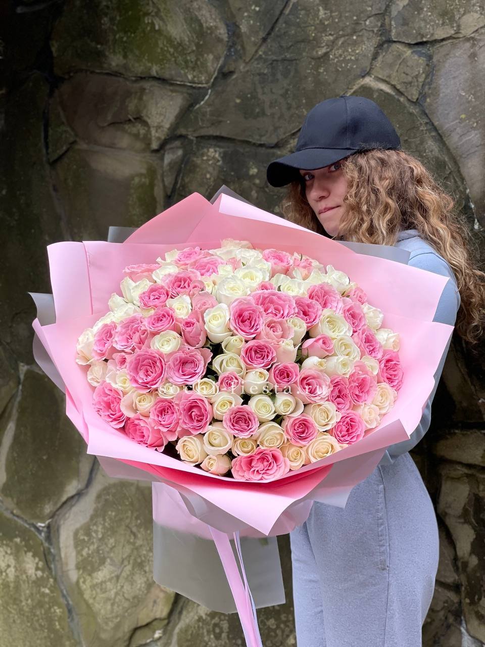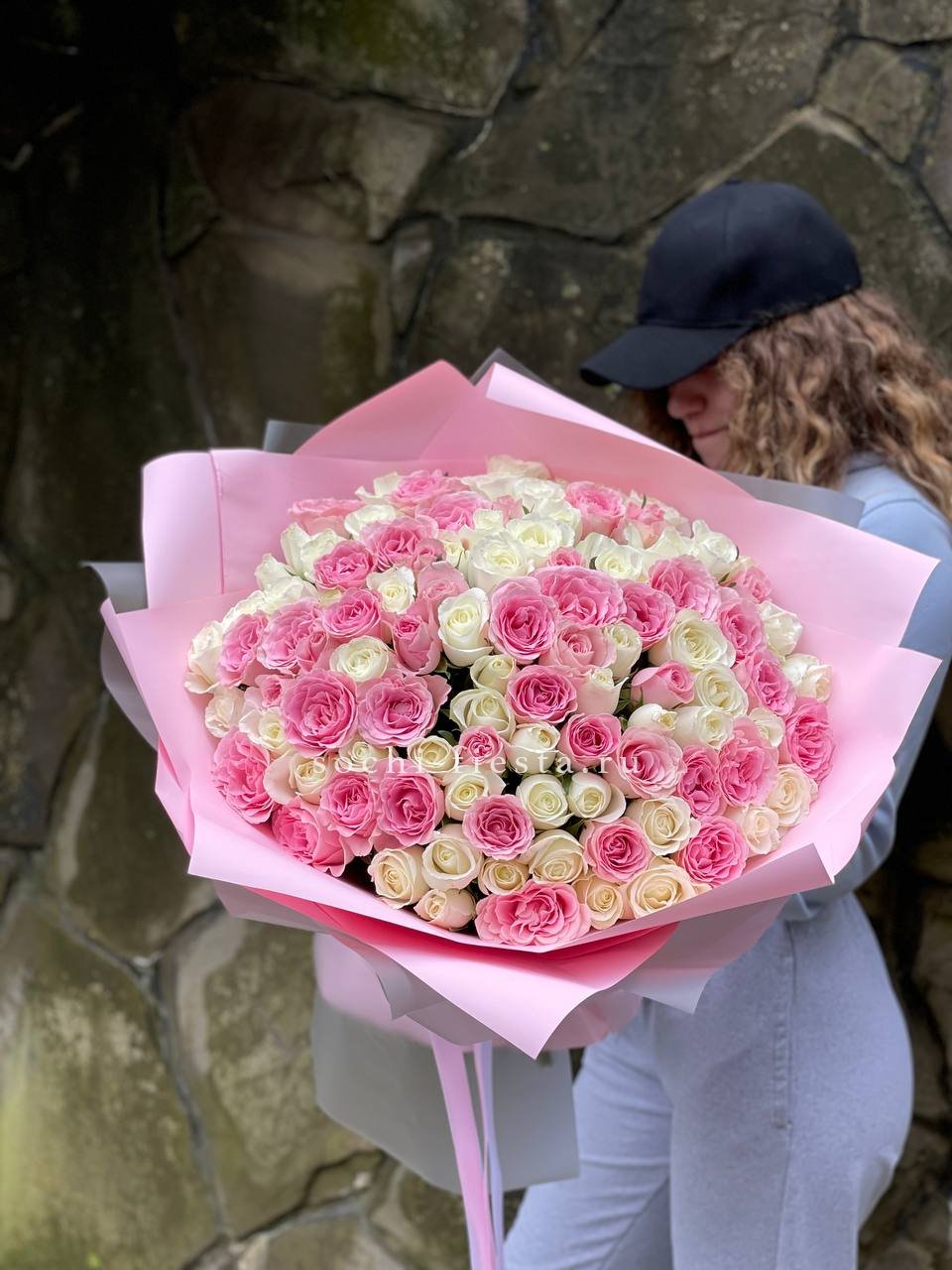 55 роз белого и розового оттенков или же с добавлением кремовой розы, лента, упаковка.