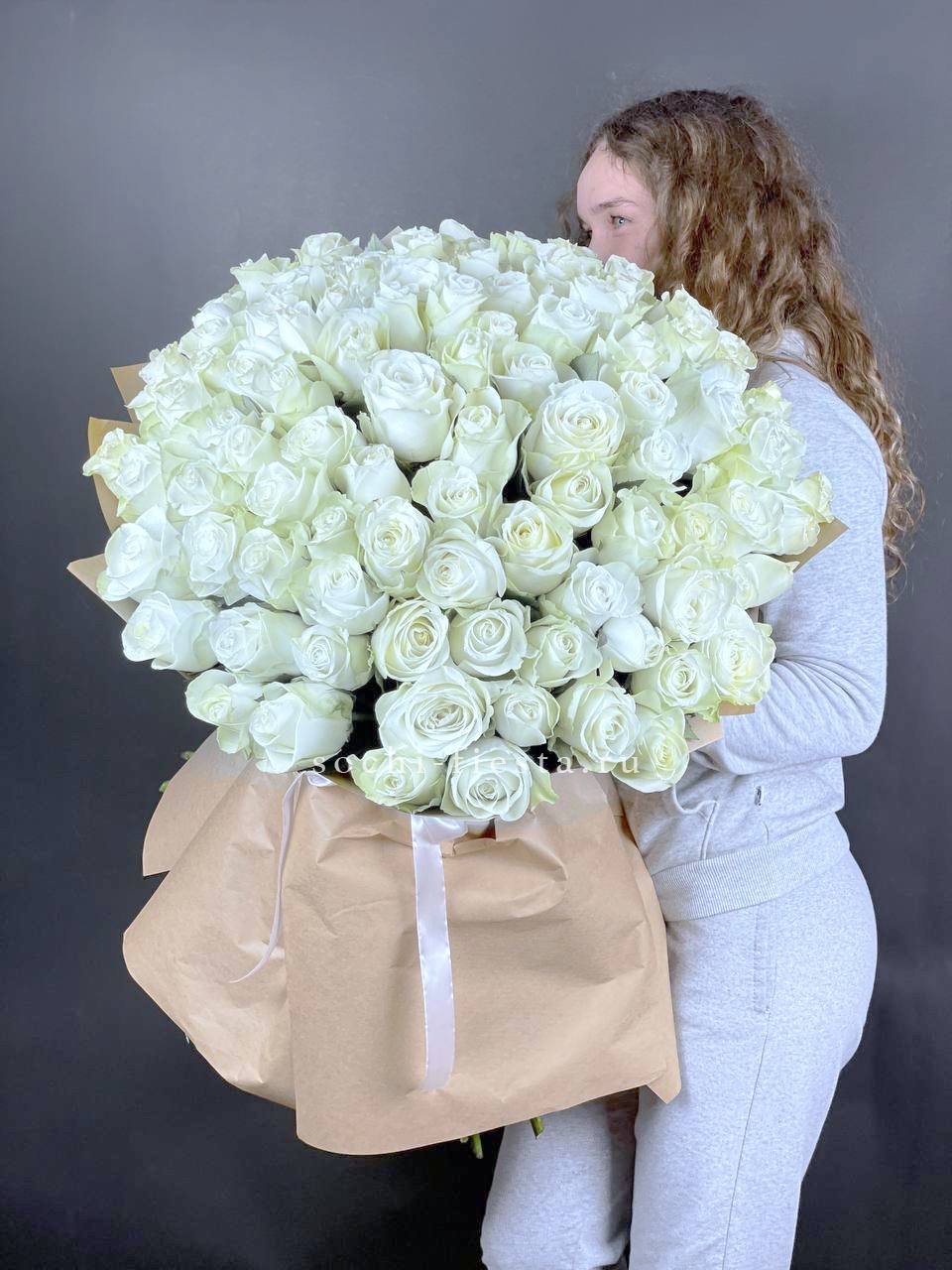 Сто один бутон в бело-розовой палитре создают объёмное облако цвета. Композиция впечатляет масштабом и наполняет пространство мягким сиянием лепестков.
