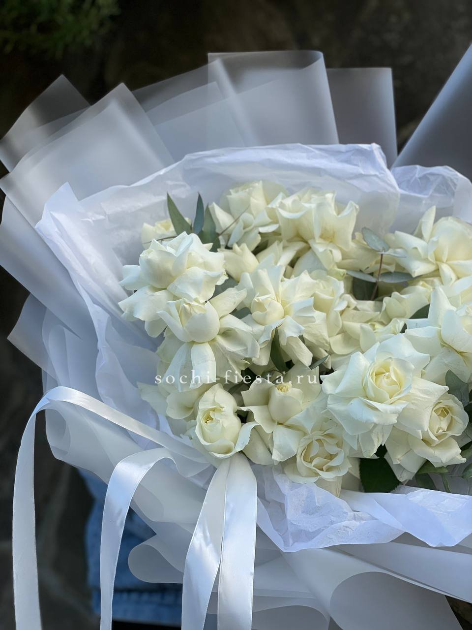 25 белых роз, лента, упаковка на выбор.