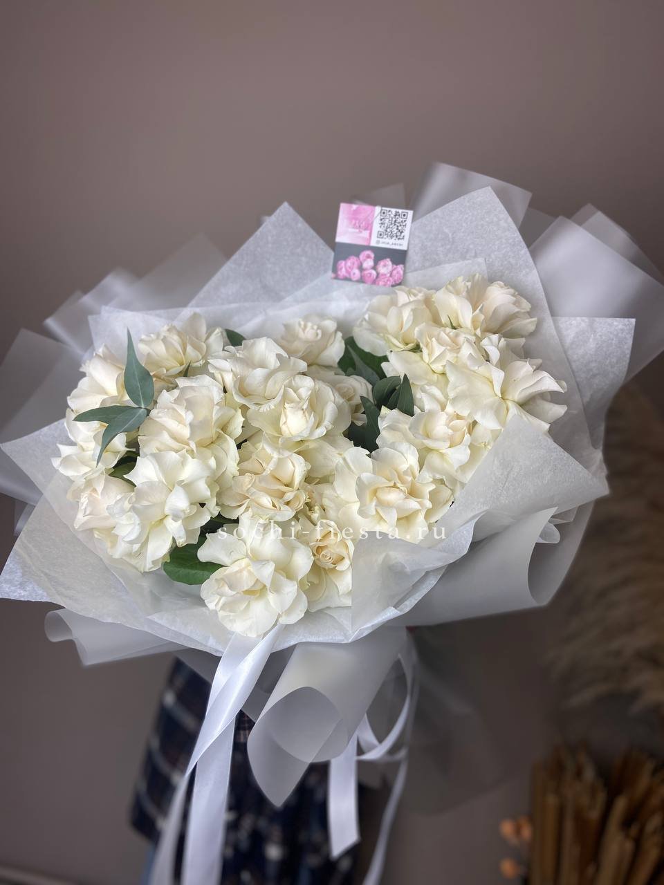 Двадцать пять белых роз образуют объёмную композицию с выразительным силуэтом. Плотная сборка и ритмичное расположение бутонов создают графичное впечатление.