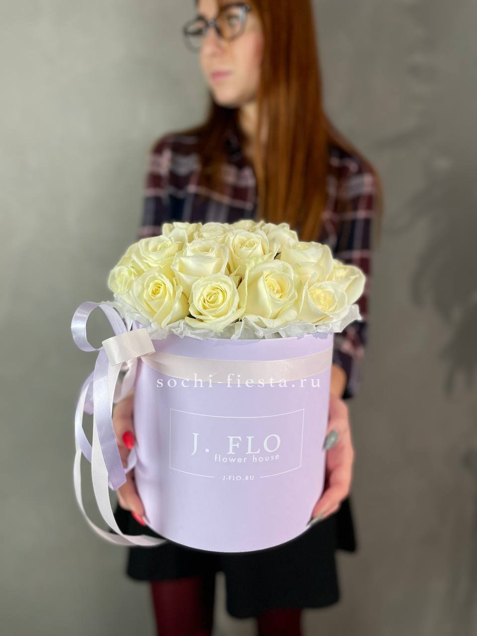 Тридцать семь белых французских роз собраны в круглый бокс с ветками эвкалипта. Плотная укладка бутонов создает объемную композицию, где каждый цветок виден и держит форму. Безупречное решение для яркого события.