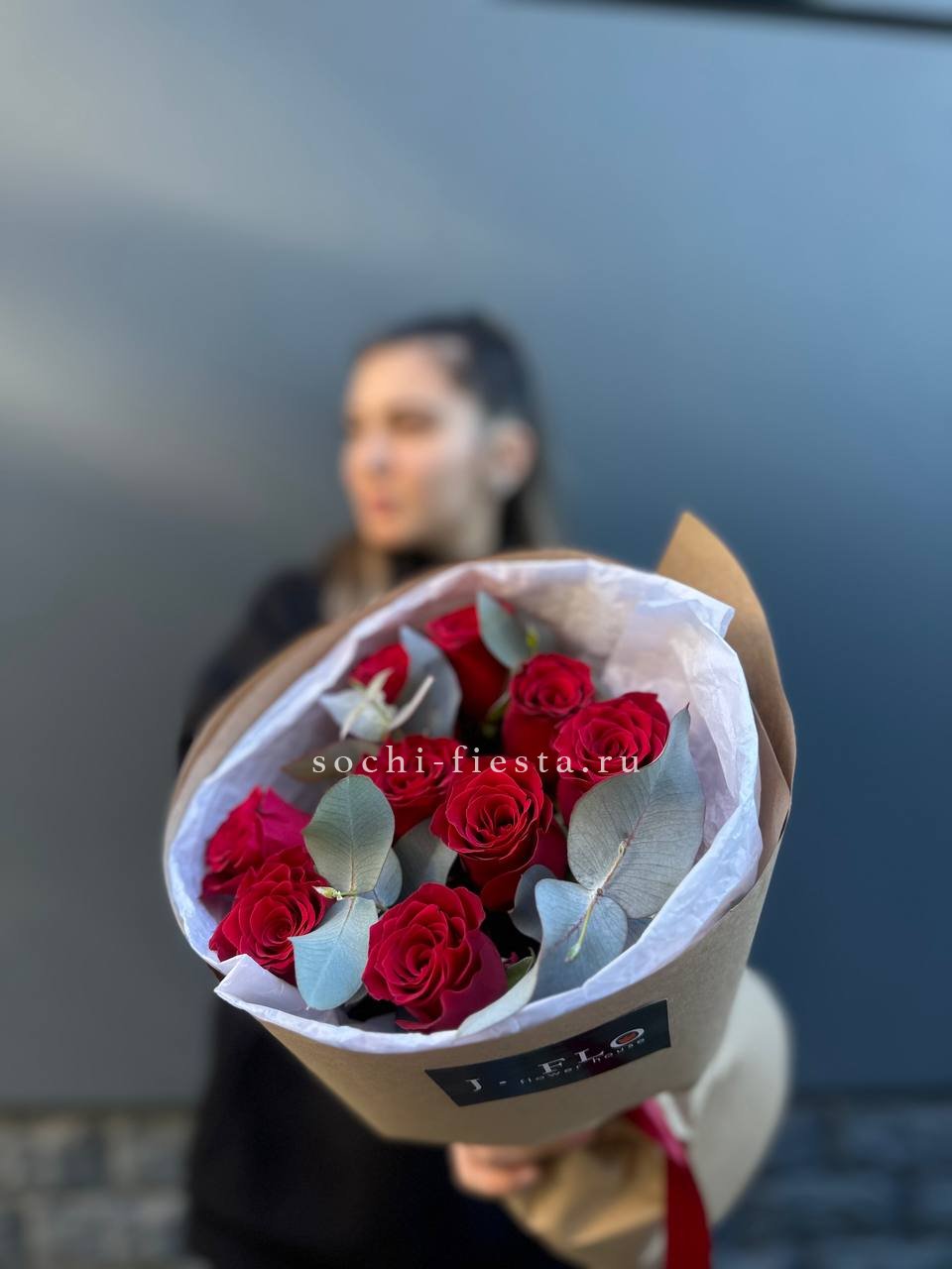 9 красных роз, эвкалипт, лента, крафт.