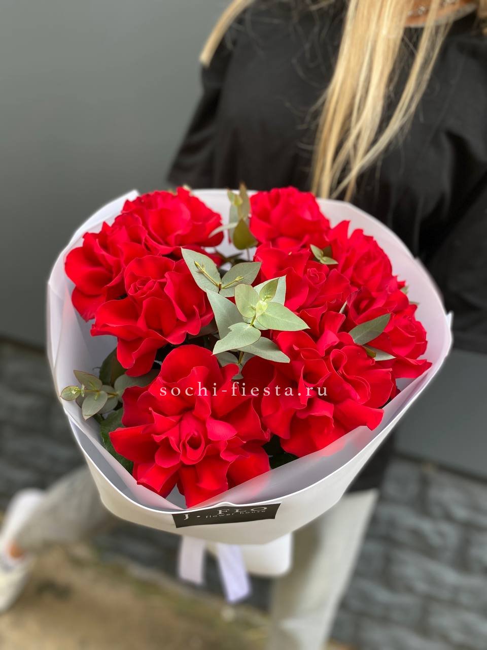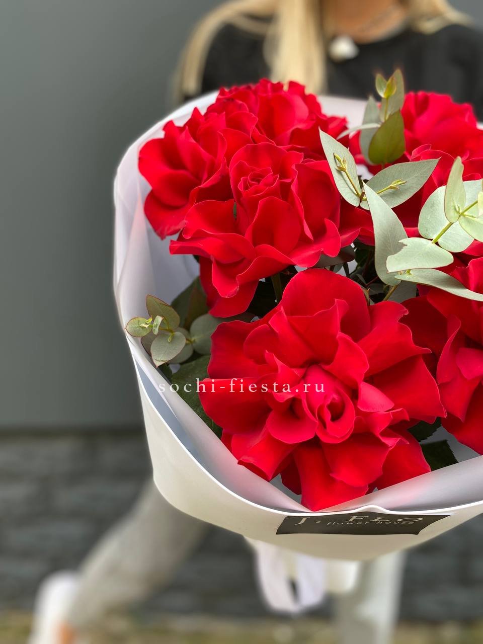 Алые розы с бархатистыми лепестками в авторской упаковке. Вы выбираете количество стеблей и получаете букет, который говорит без слов о силе чувств.