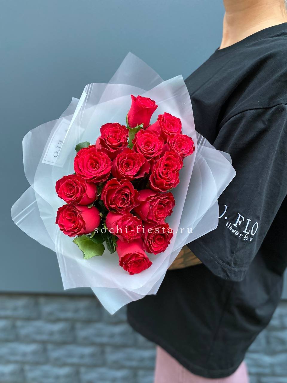 Пятнадцать бутонов насыщенного красного оттенка собраны в плотную композицию. Классическая форма с авторским оформлением подходит для романтичных жестов и ярких моментов.