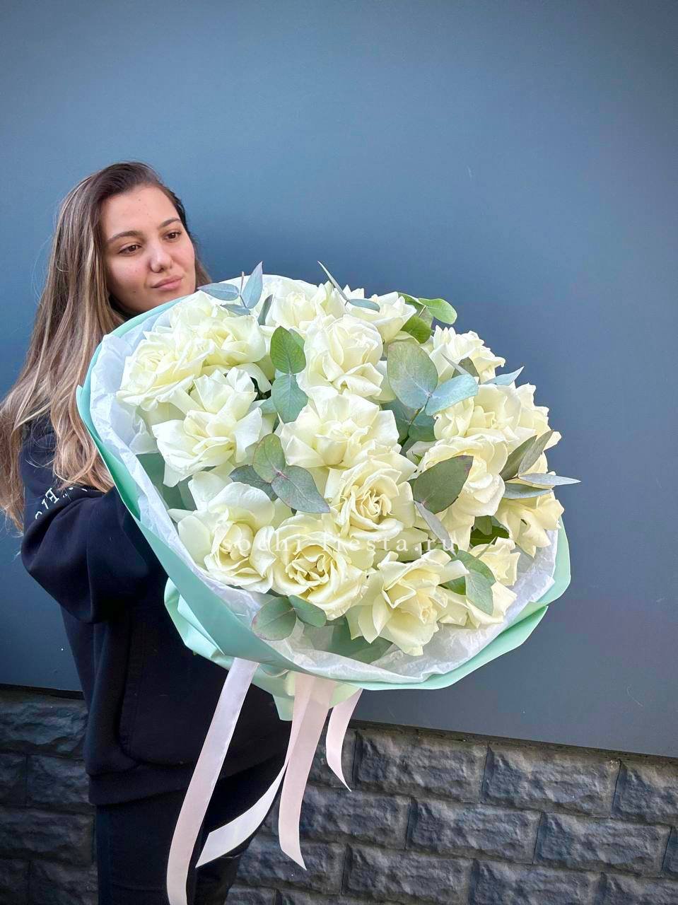 Девятнадцать вывернутых роз собраны в плотный букет, где каждый бутон развернут наружу и демонстрирует сложную структуру лепестков. Белый цвет звучит чисто и уверенно.
