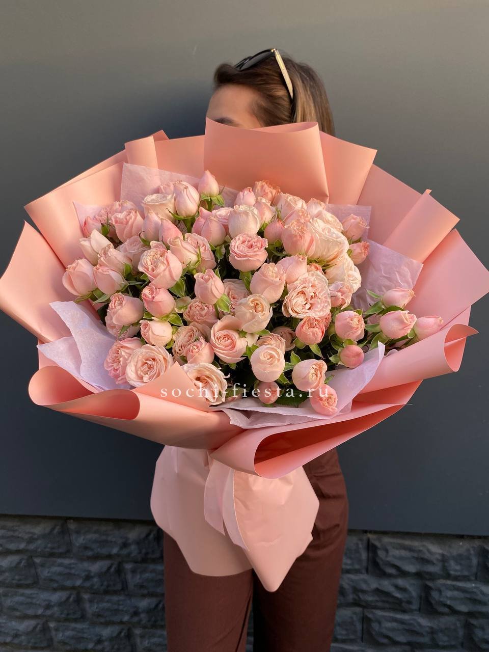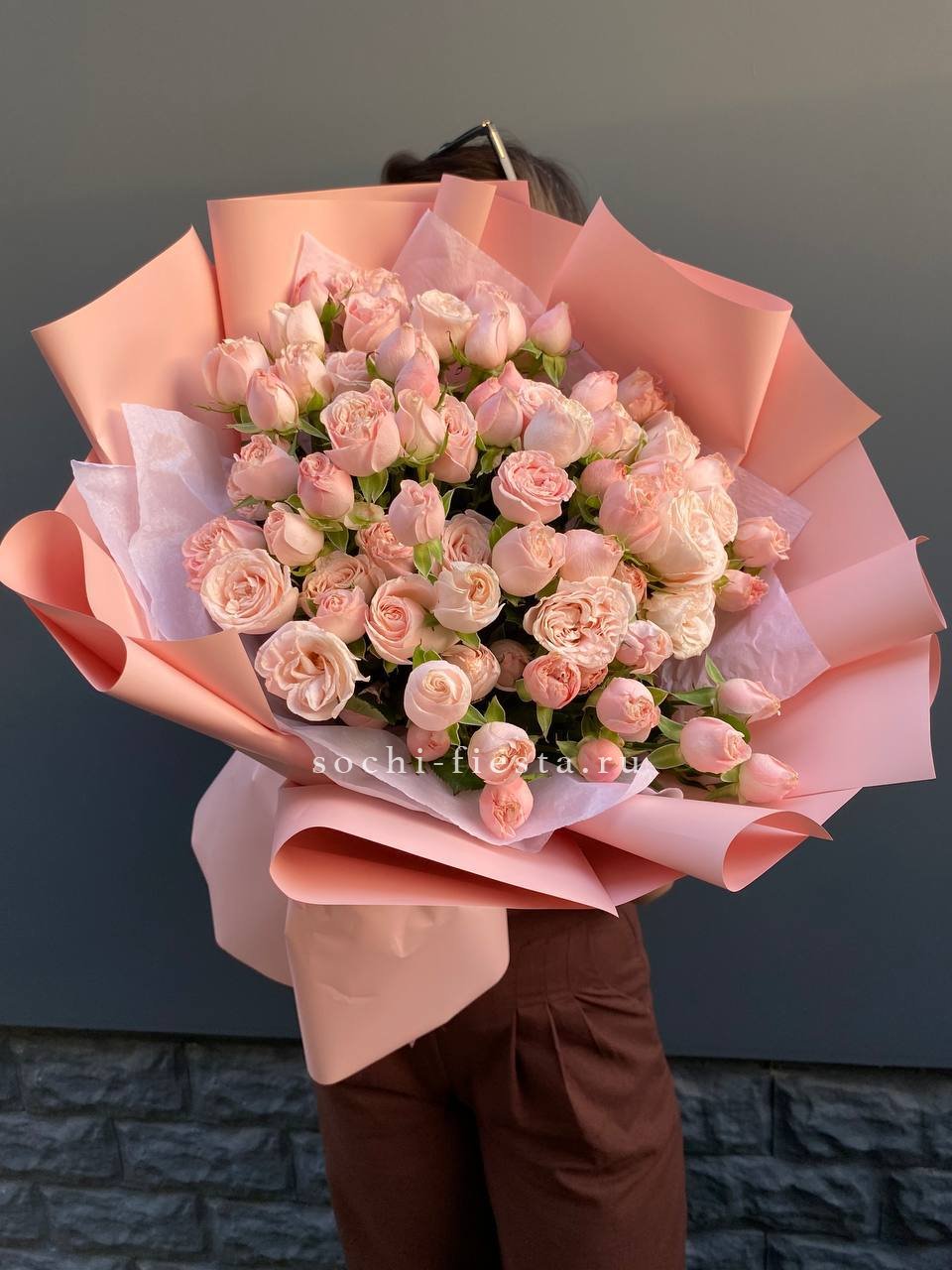 Свежий букет с множеством мелких бутонов образует воздушное облако. Кустовые розы собраны так, что композиция кажется легкой и подвижной, словно только что сорвана в саду.