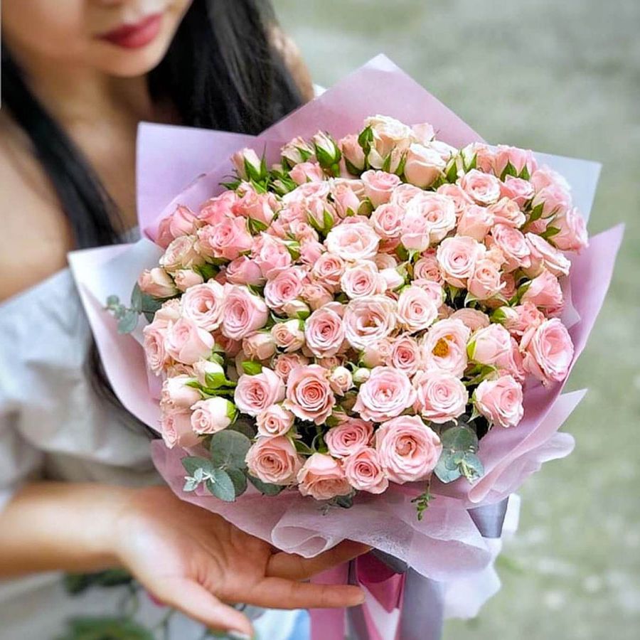 кустовая роза - 19 шт., эвкалипт, лента, дизайнерская упаковка.