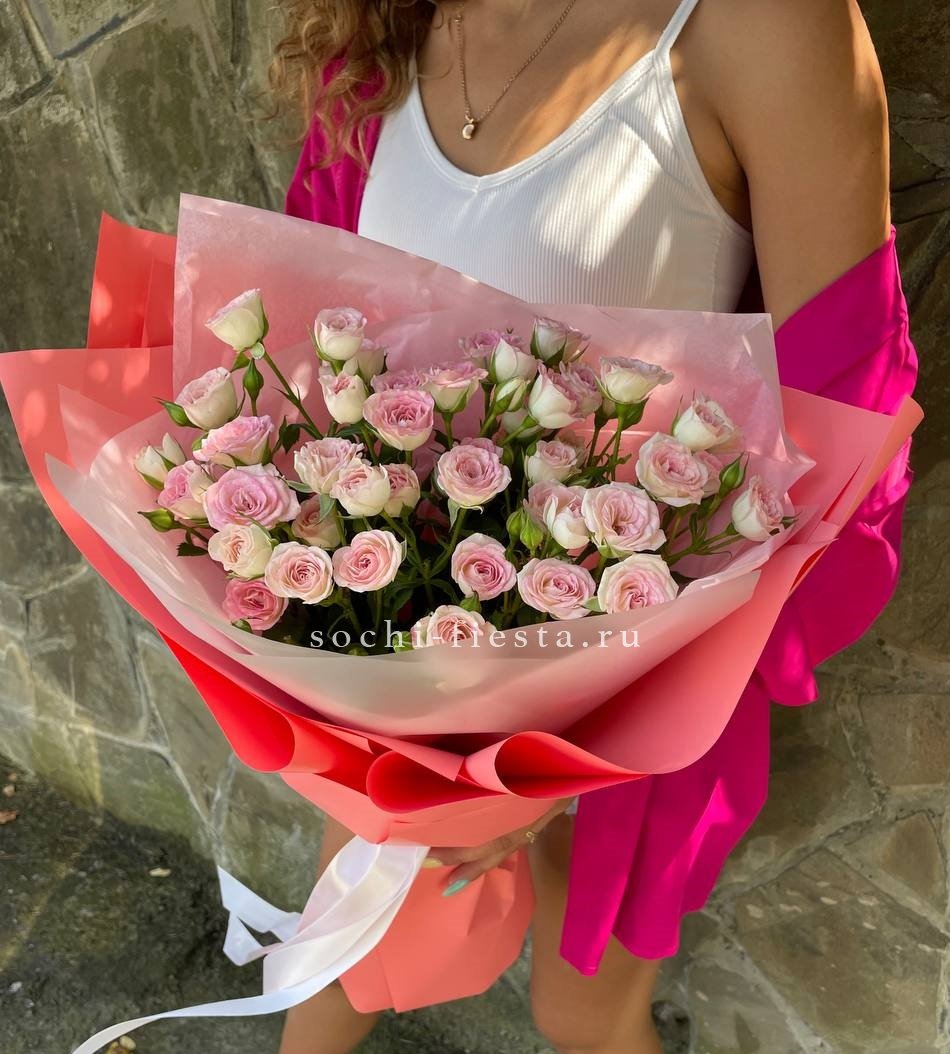 Девять кустовых роз собраны в компактную форму с мягким розовым оттенком. Множество небольших бутонов создают объемную текстуру и природную легкость. Букет упакован в матовую бумагу с лентой.