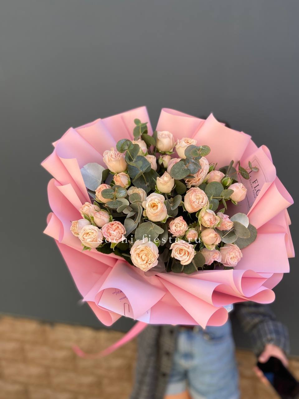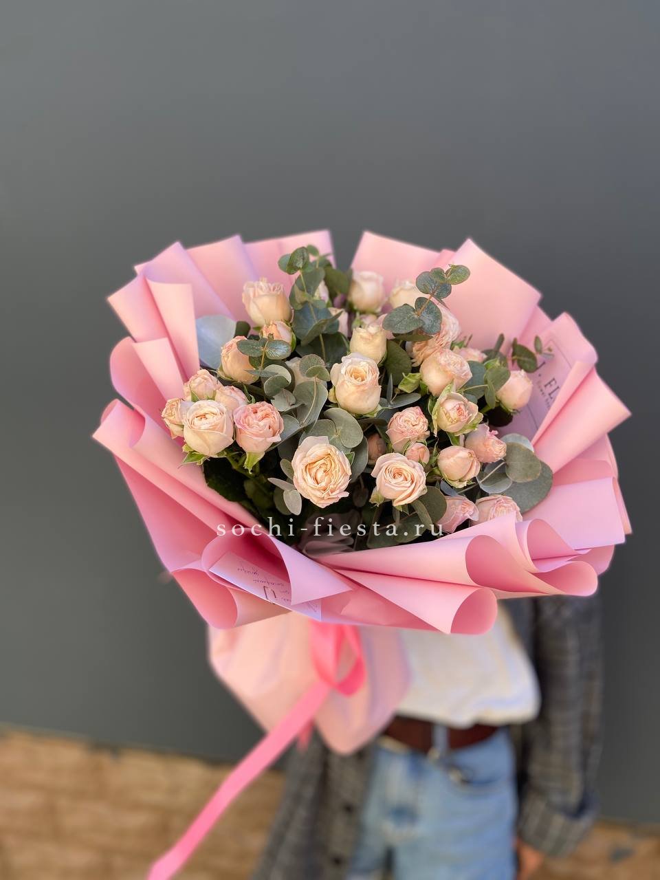 розы пионовидные 21шт, эвкалипт, пленка, лента.
