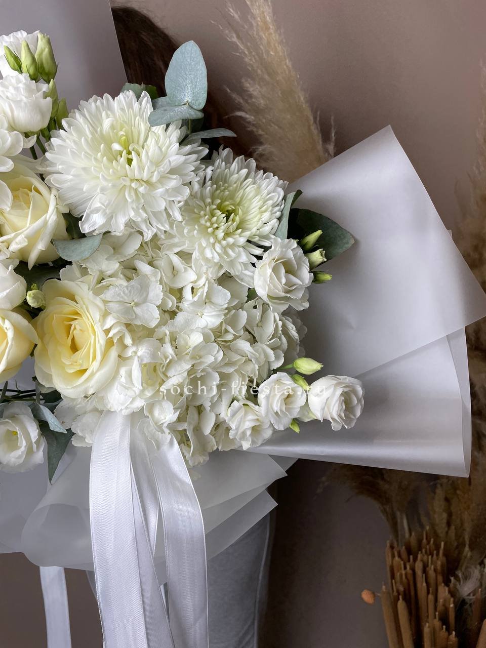Белые французские розы переплетаются с пушистыми соцветиями маттиолы и хлопка. Гортензия и пионовидные бутоны создают объём, а ковыль вносит лёгкую небрежность в общий ритм.
