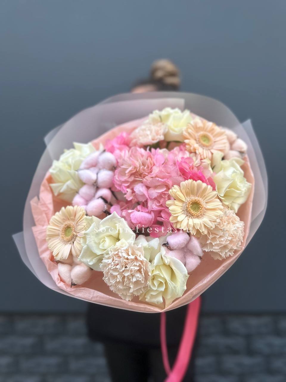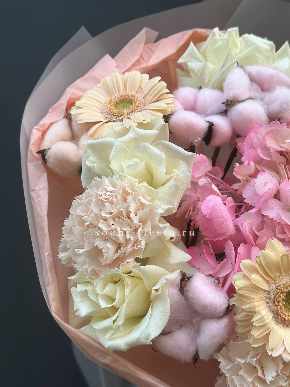 гортензия, французские (вывернутые) розы, лента, дизайнерская пленка, тишью.