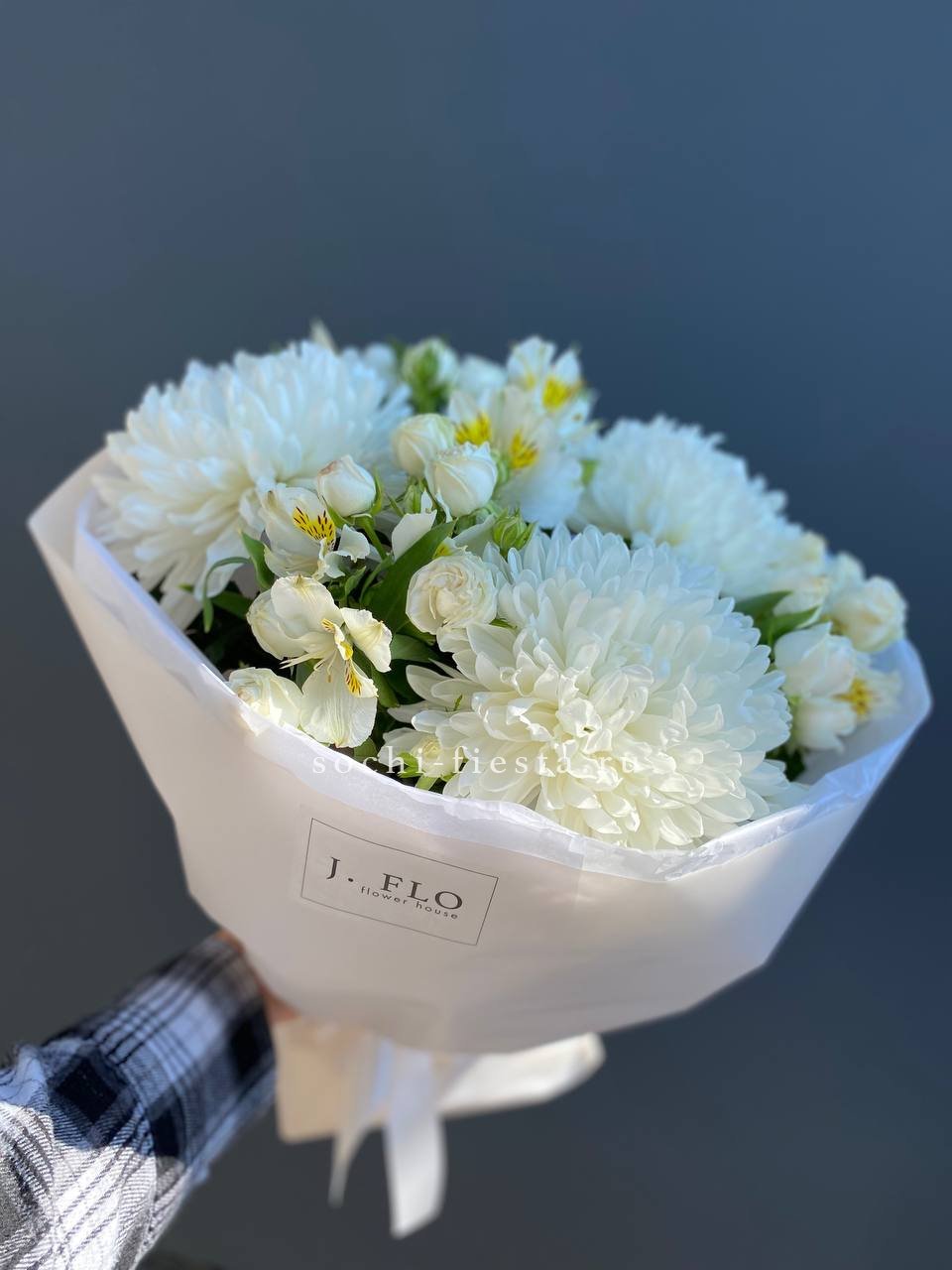 хризантема, кустовые розы, альстромерия, авторское оформление,  лента Возможна замена сезонных цветов.