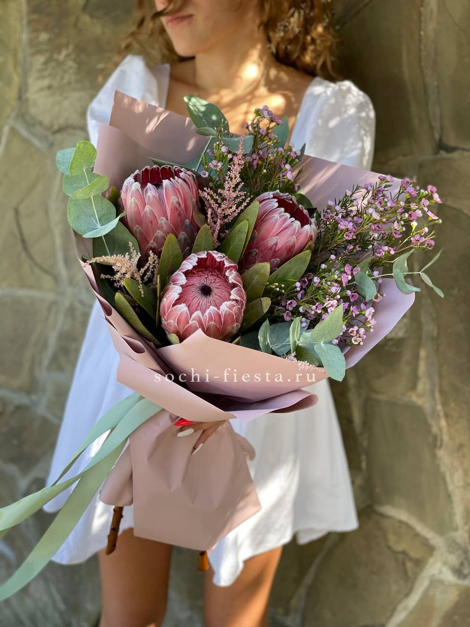 протея, декоративная зелень в зависимости от сезона, дизайнерская упаковка.