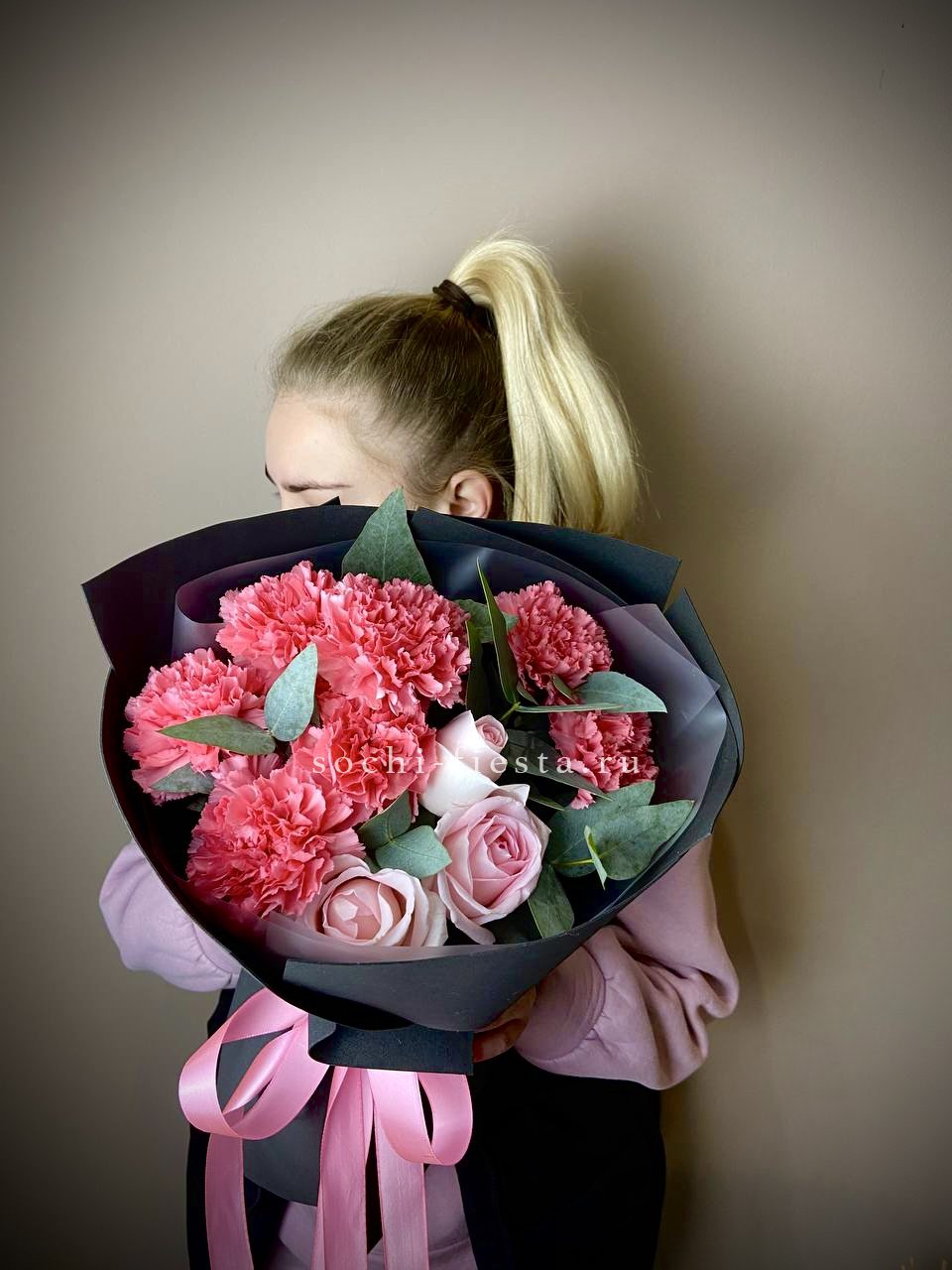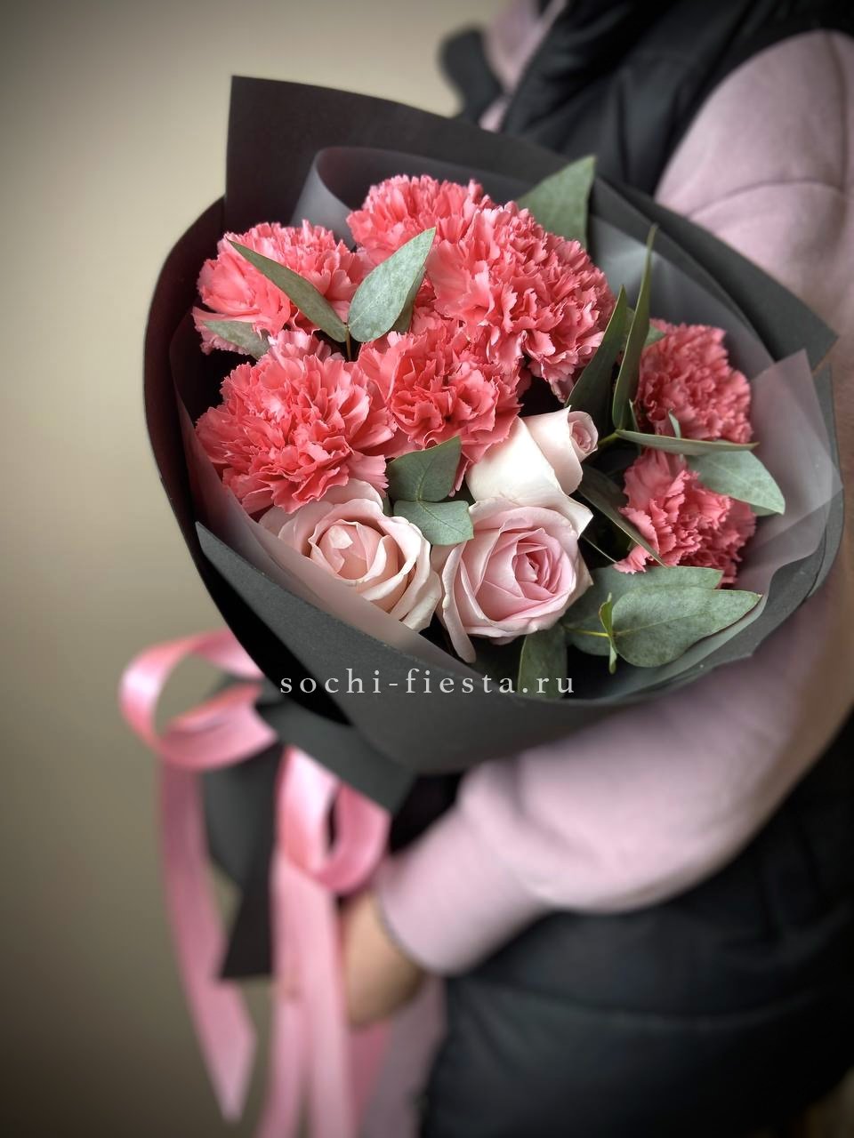 Розы и диантусы образуют лёгкий микс с выразительной игрой фактур. Эвкалипт добавляет графичности и свежести общей картине. Компактная сборка удобна для размещения на столе или комоде.
