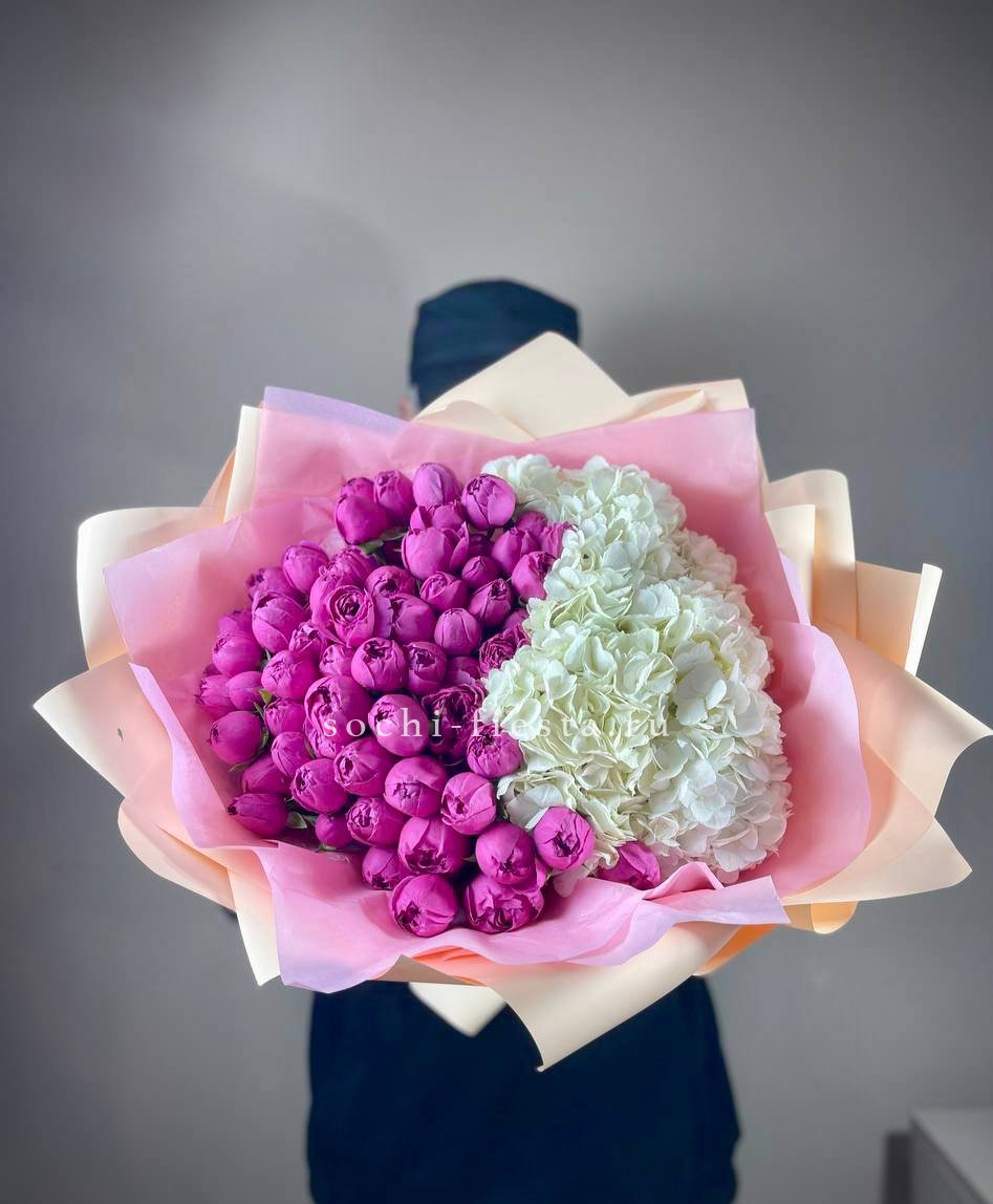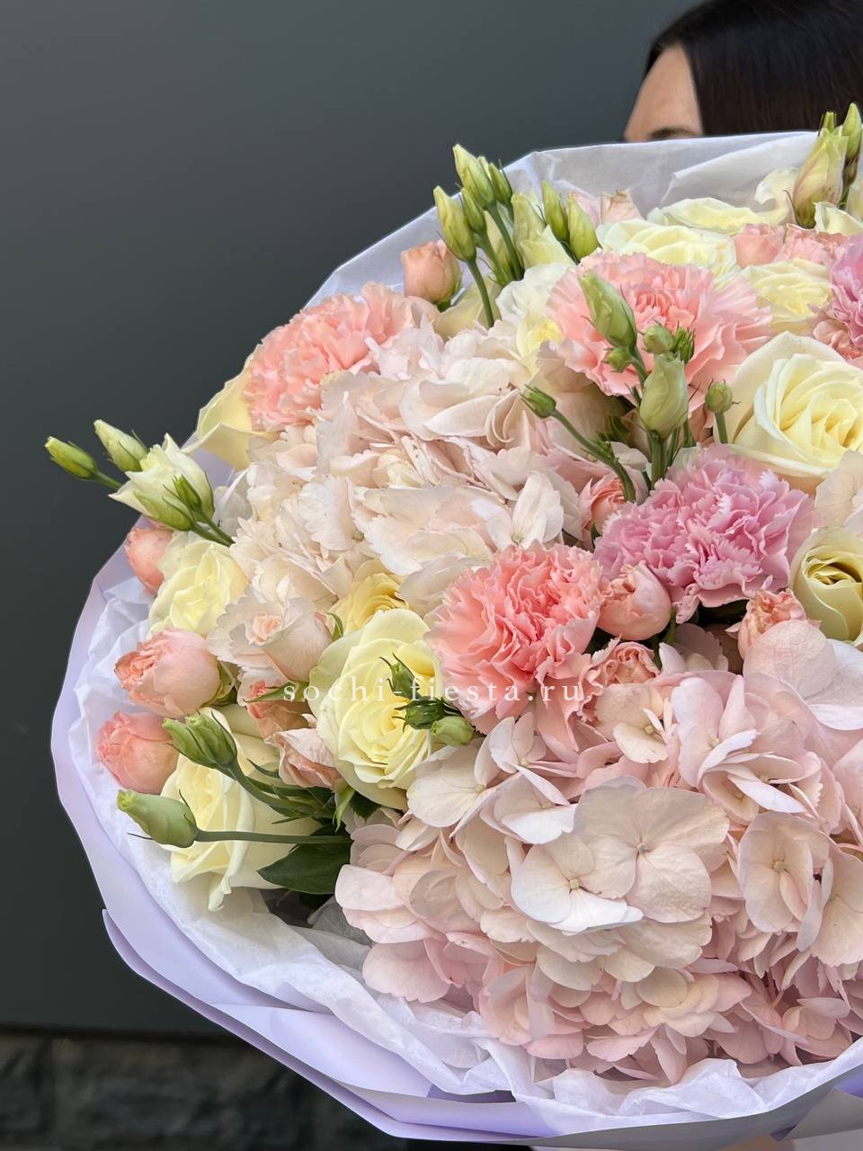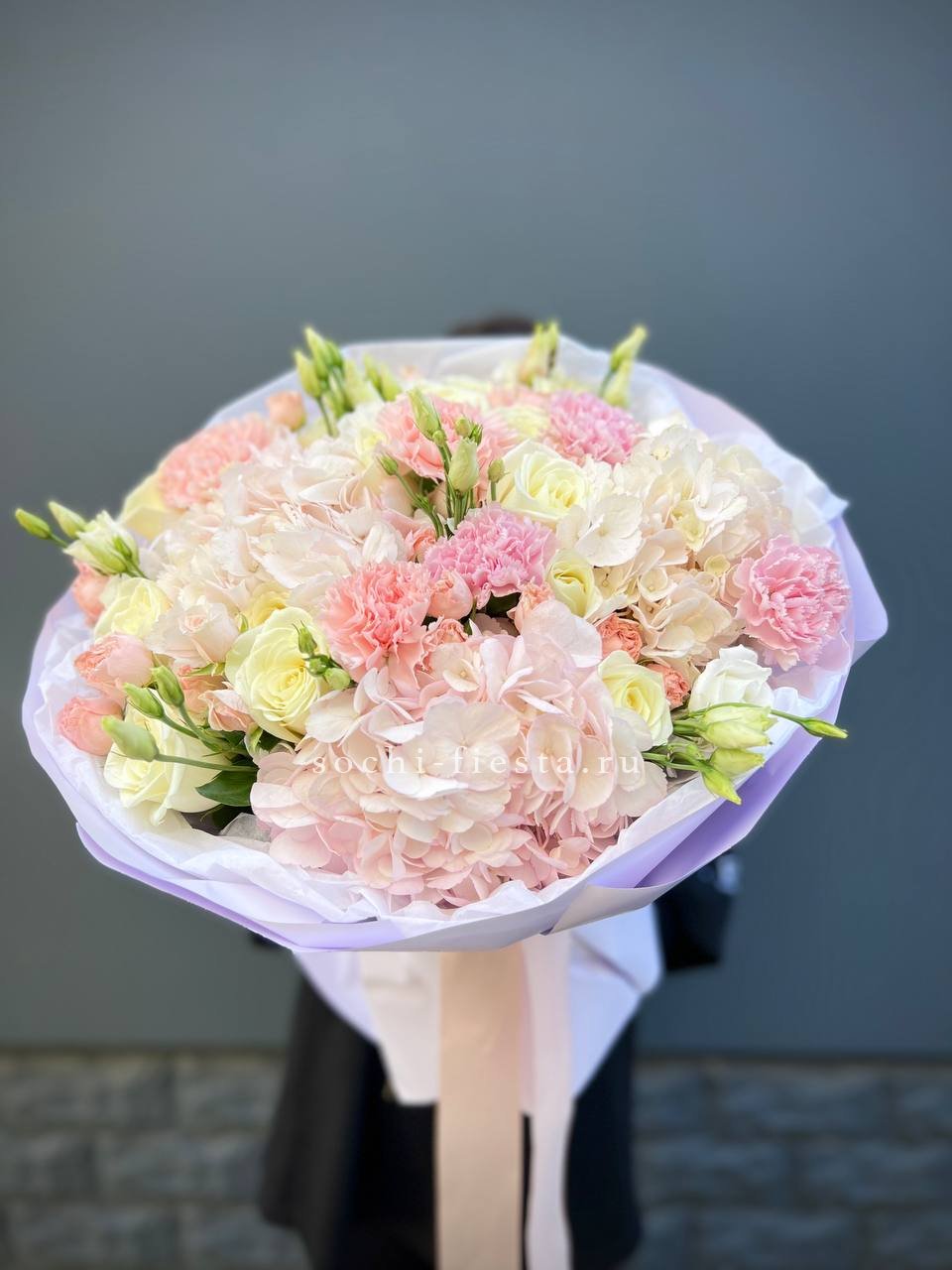 гортензия, диантус, хризантема, эустома, розы, озатамус, пленка.