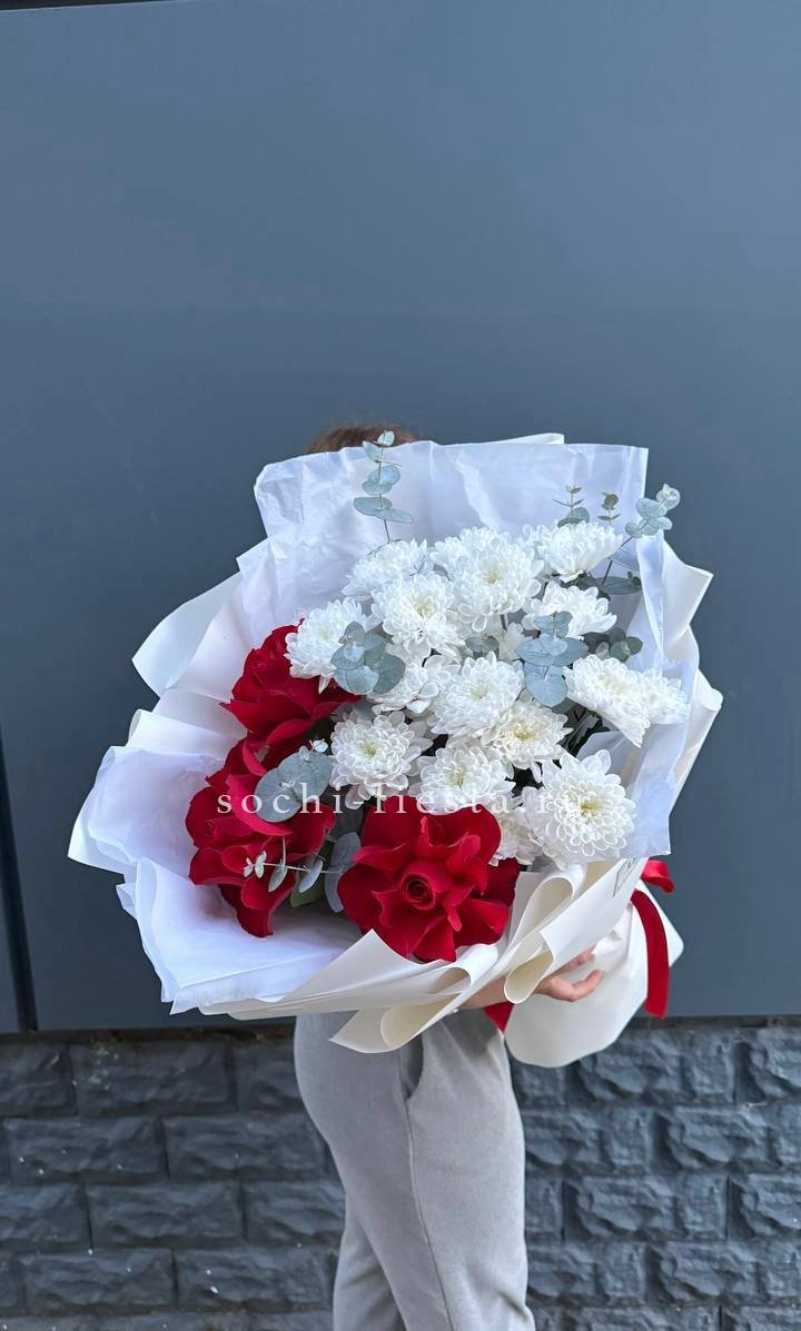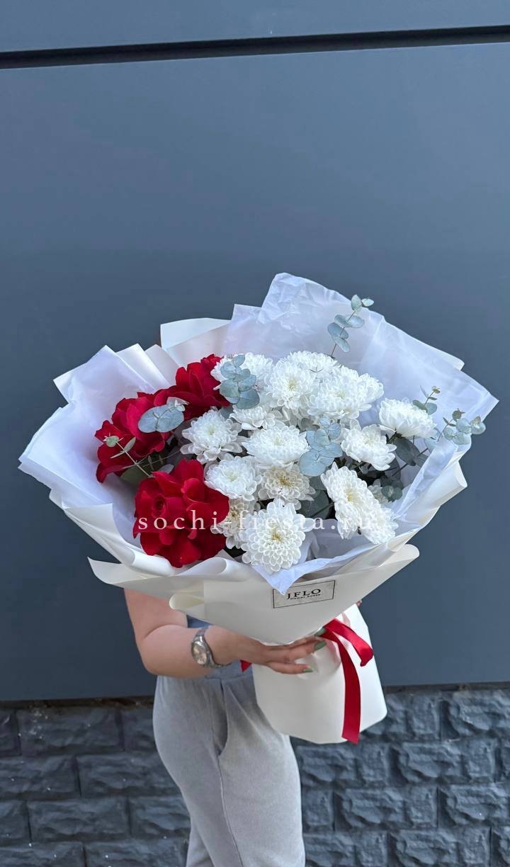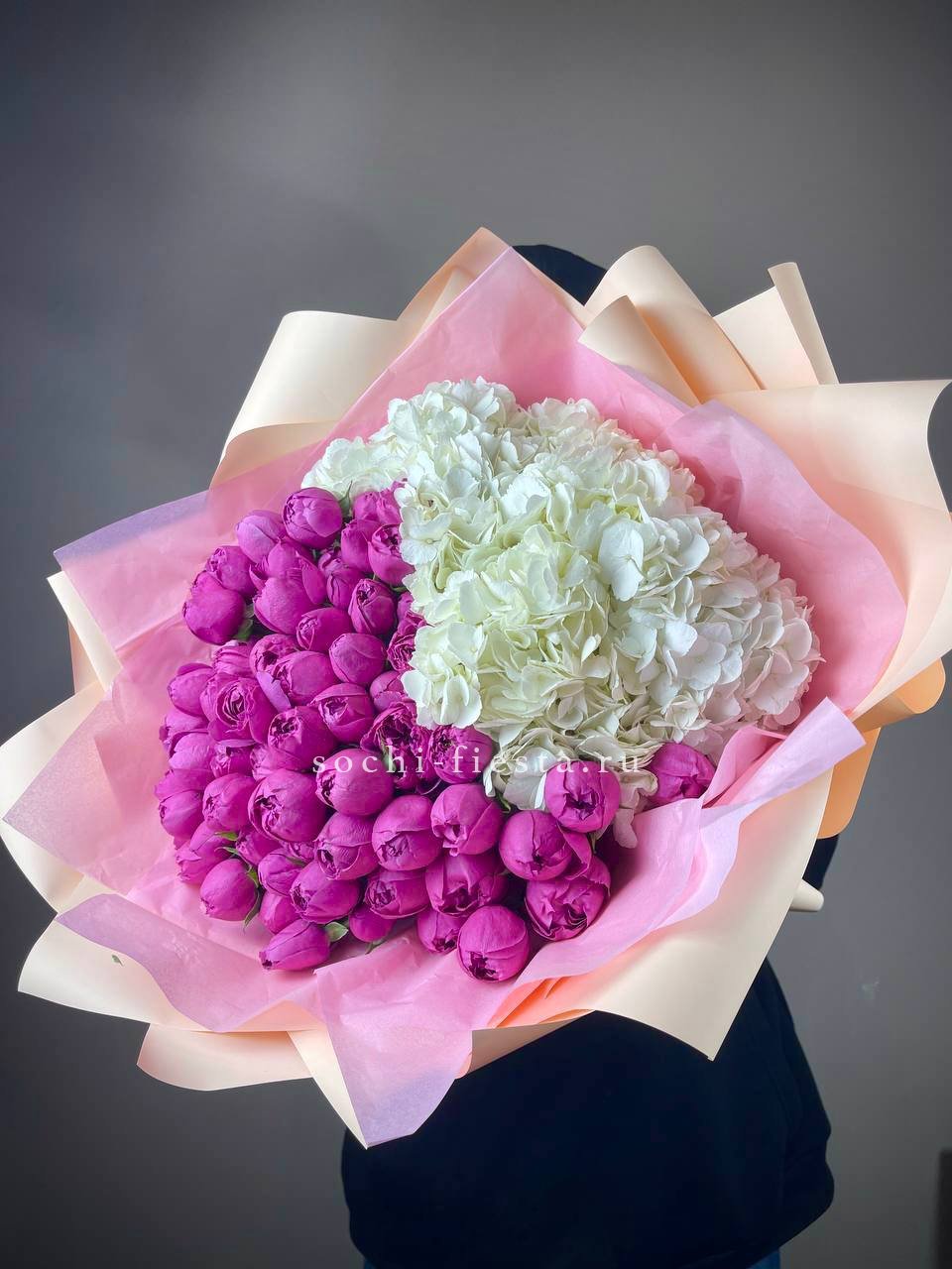 гортензия, диантус, хризантема, эустома, розы, озатамус, пленка.