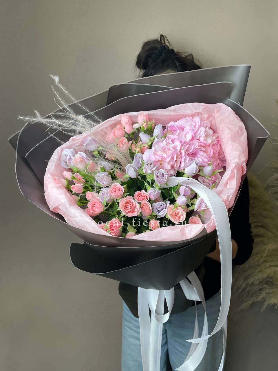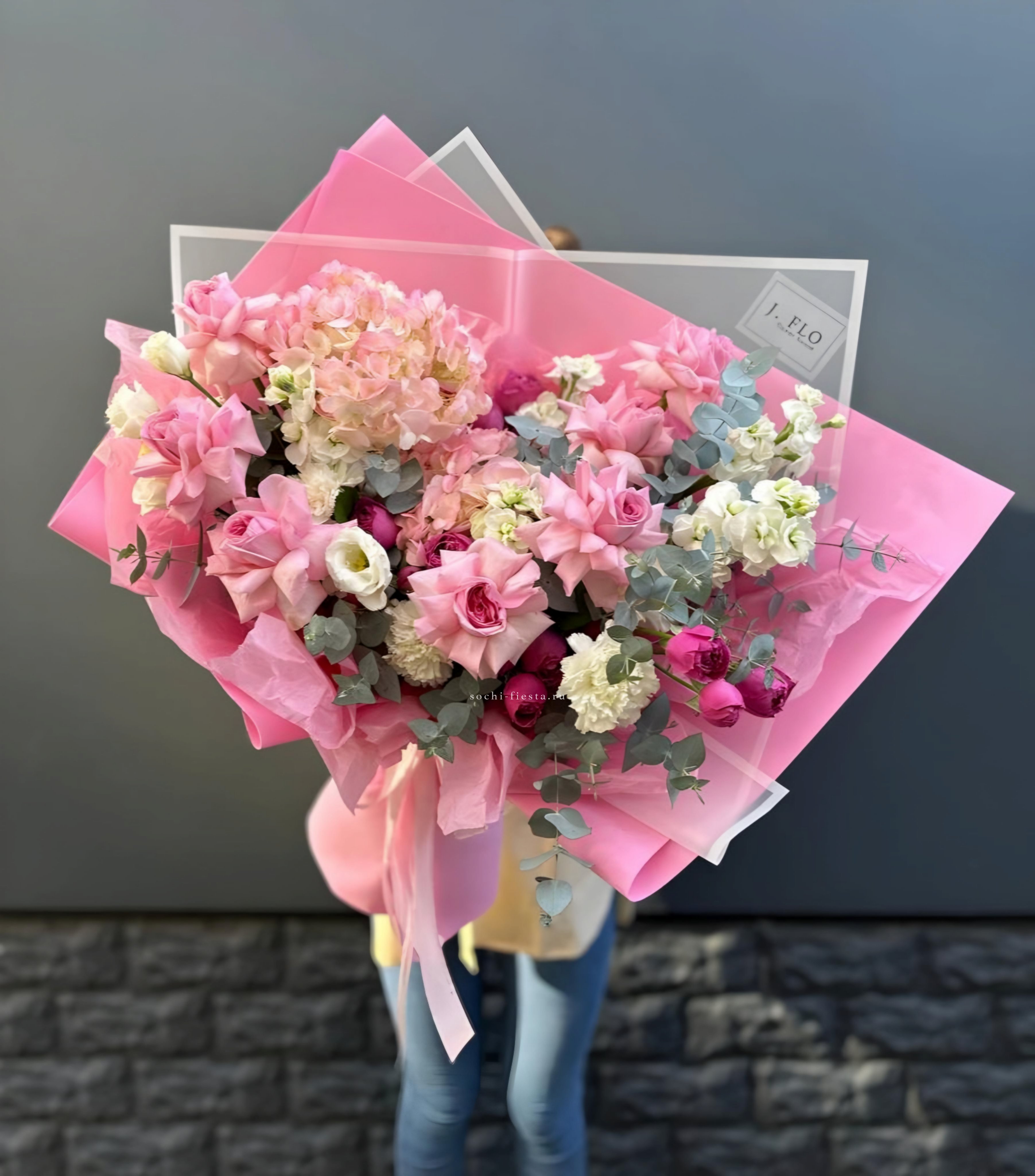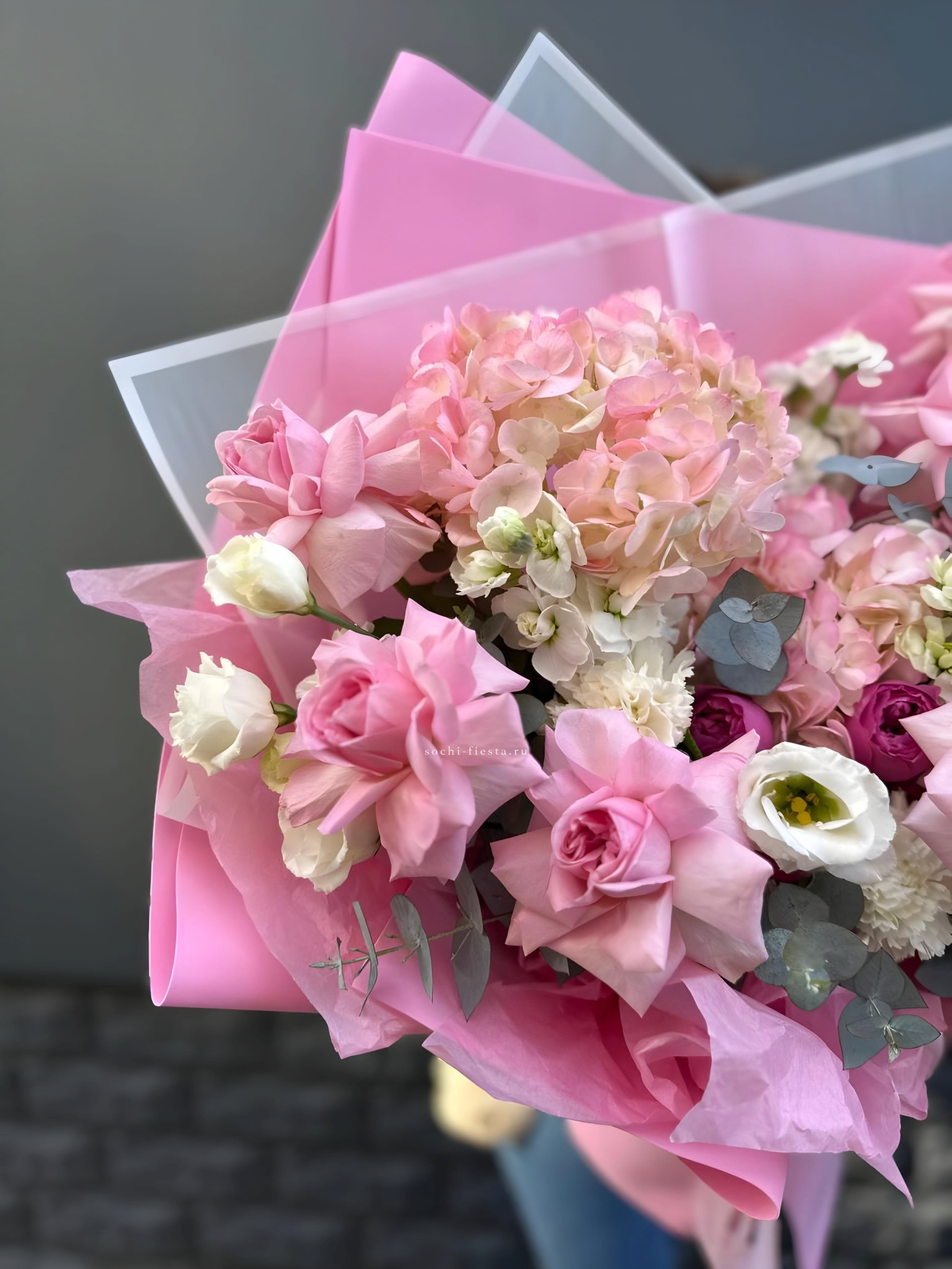 Воздушная композиция с крупными соцветиями гортензии и пышными розами создает ощущение легкости и объема. Эвкалипт добавляет свежести, а бомбастик расставляет яркие акценты между бутонами.