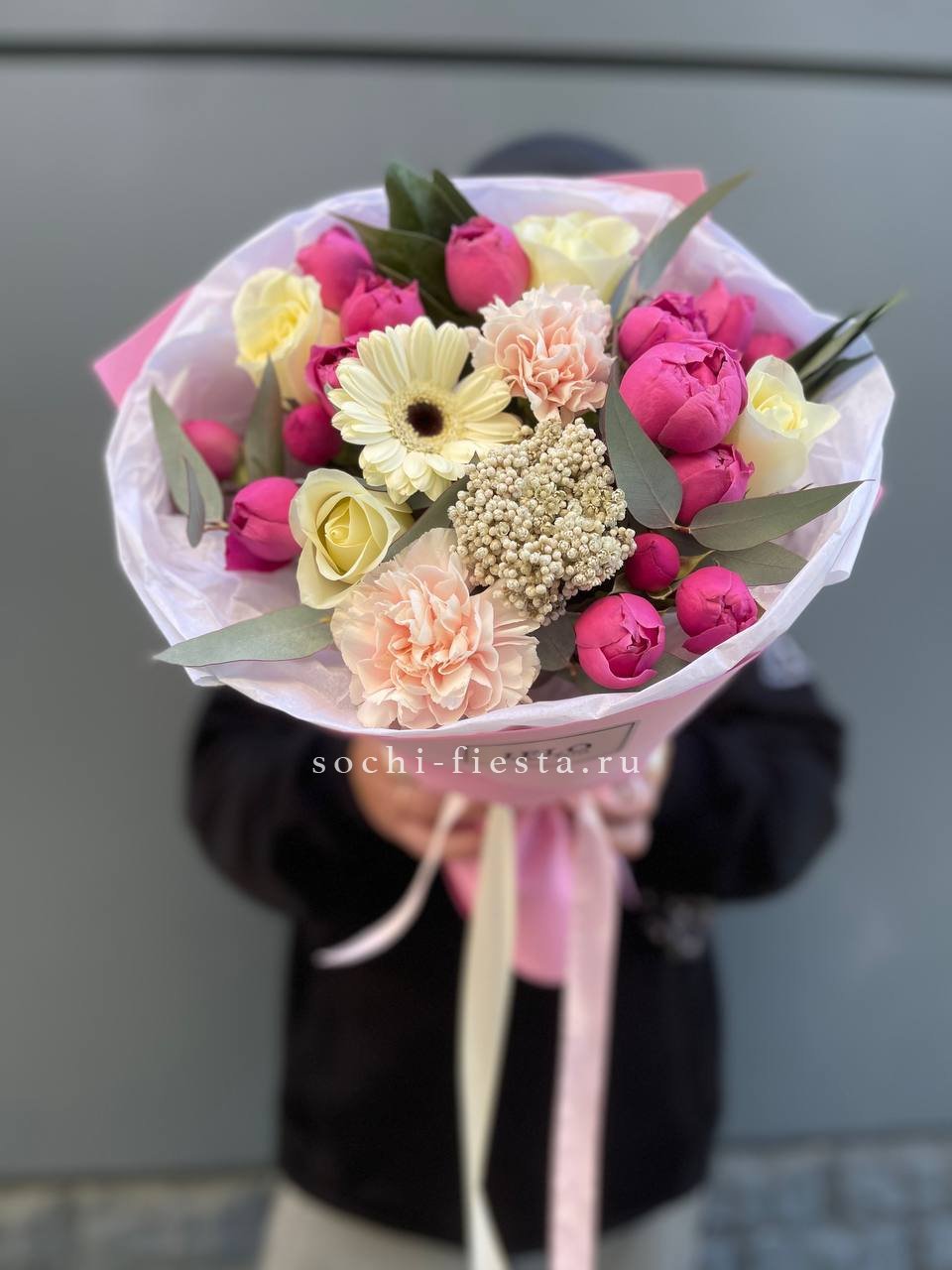Пышный микс из гербер, хризантем и роз в обрамлении диантуса и статицы. Букет собран плотно, с яркими акцентами по всей форме. Озатамус и эвкалипт добавляют глубину и завершенность композиции.