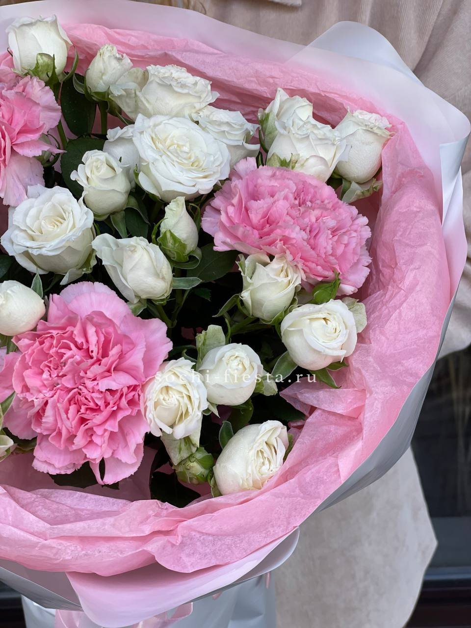 Плотные головки диантусов рассыпаны между кустовыми розами, создавая живую текстуру. Компактная форма букета удобна для небольших пространств и долго сохраняет свежесть.