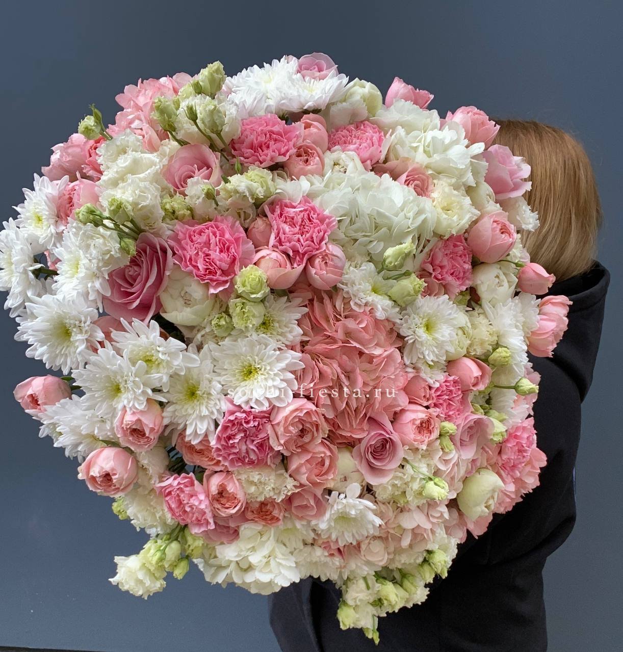 Масштабная композиция с пионами, эустомой и розами разворачивается во всей красе. Хризантемы и гортензия создают впечатляющее присутствие, которое преображает пространство вокруг.