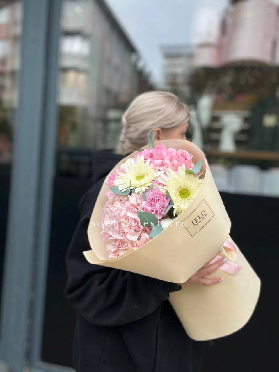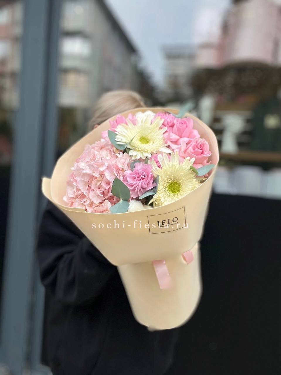 хризантема, гортензия, розовая роза, эустома, пионы ( может меняться, в зависимости от сезона), бомбастик, диантус, лента.