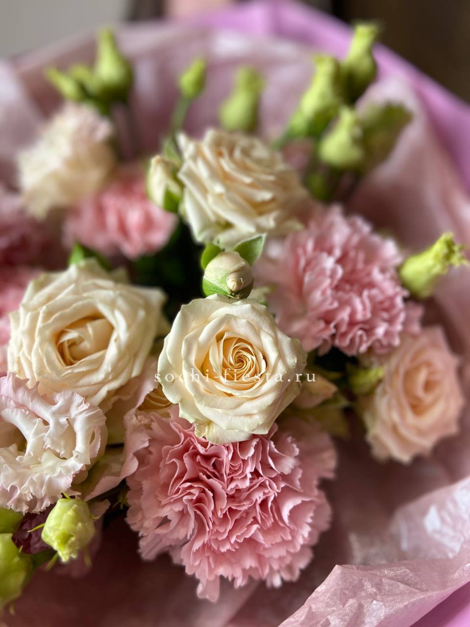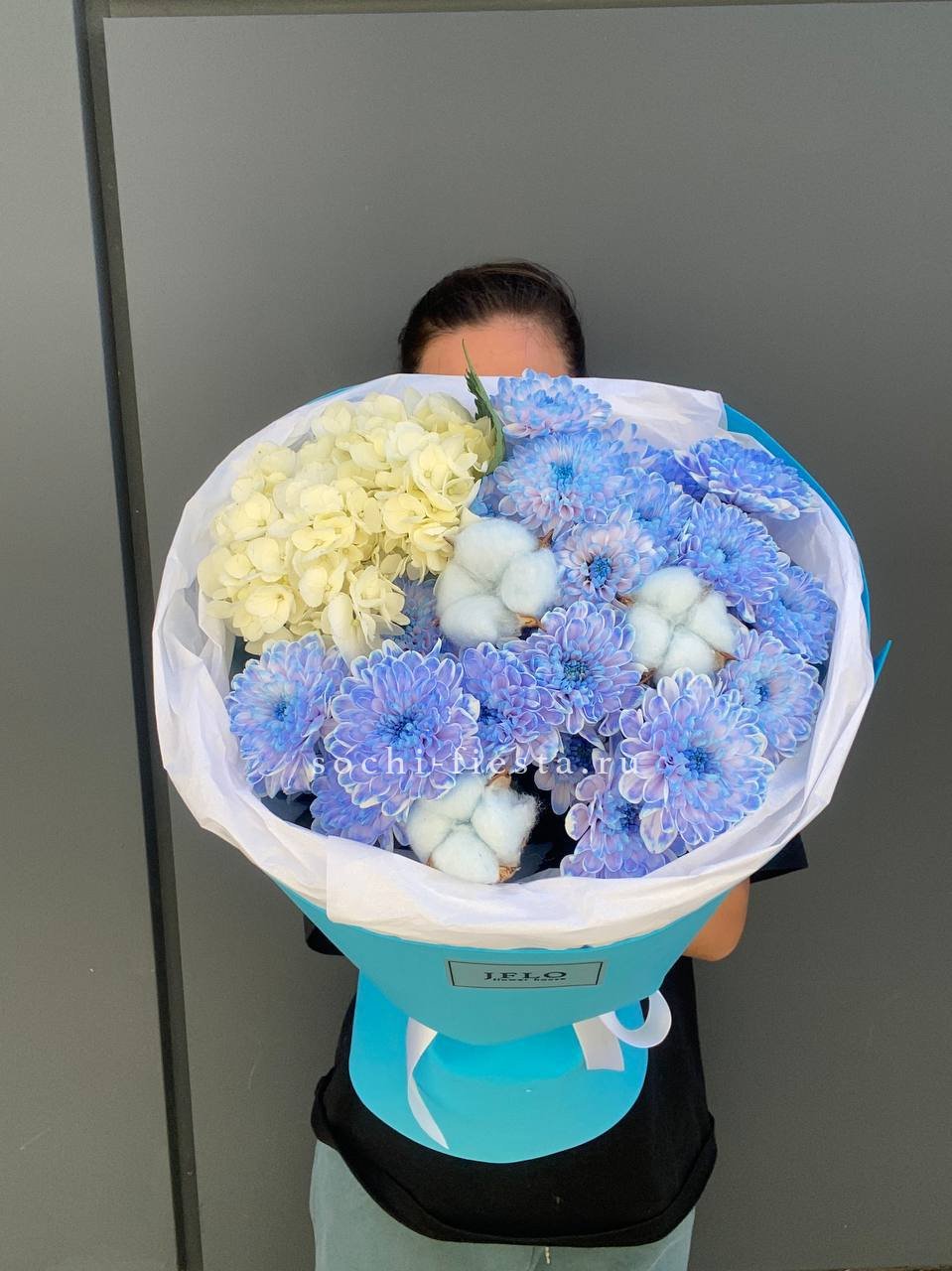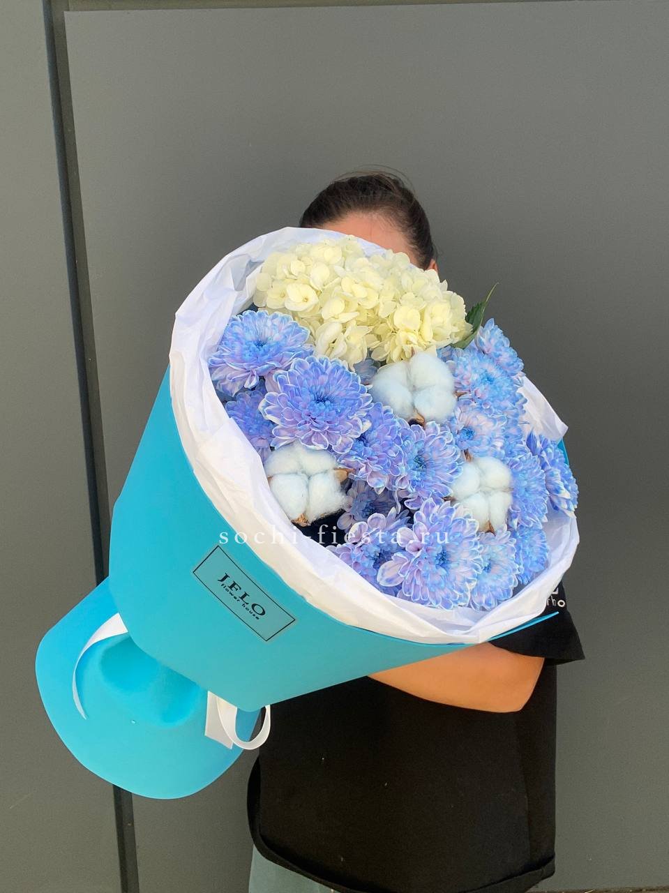 гортензия, диантус, кустовая пионовидная роза, эустома, вспомогательные цветы, эвкалипт, лента, дизайнерская упаковка.