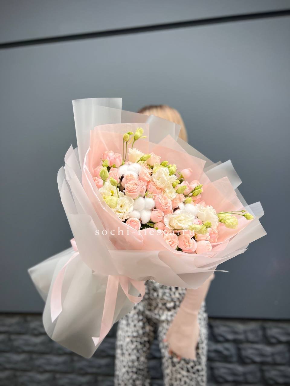 розовые розы, белые розы, диантус, бомбастик, гортензия, эвкалипт, пленка.